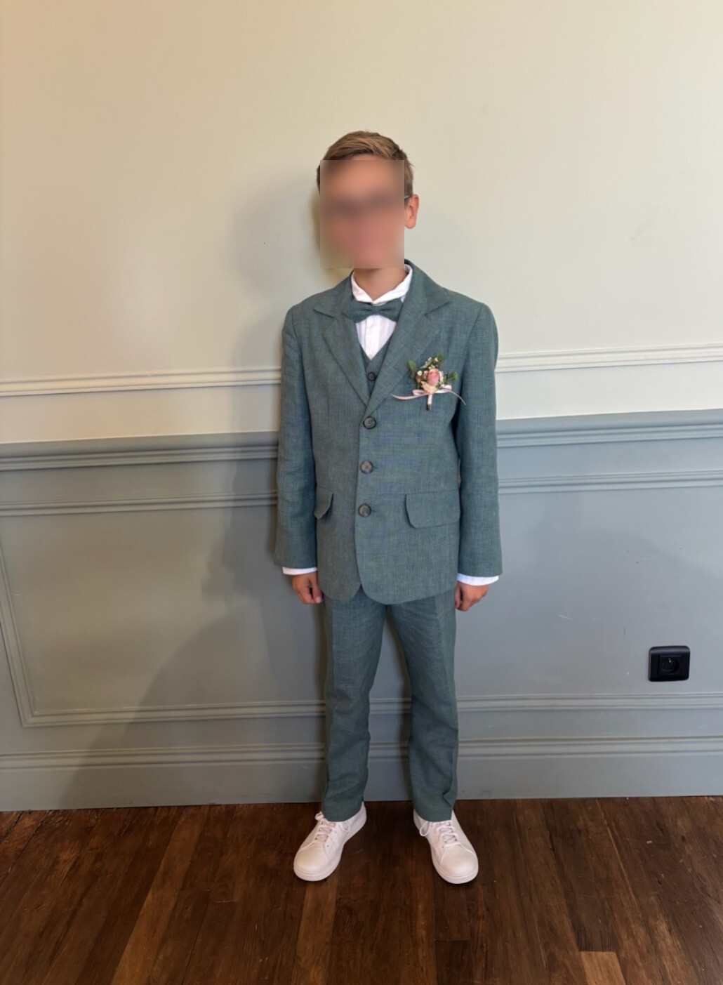 Ajustement d'un costume 3 pièces pour un enfant de 10 ans à l'occasion d'un mariage et réalisation d'un nœud de papillon.